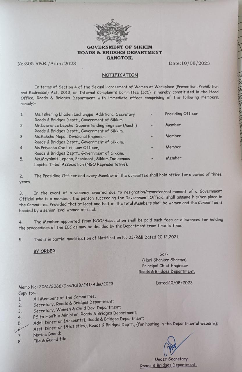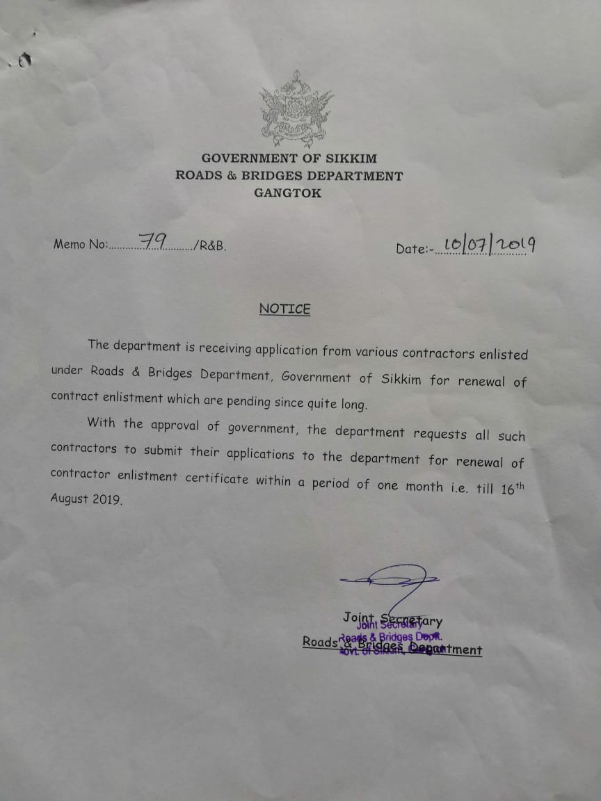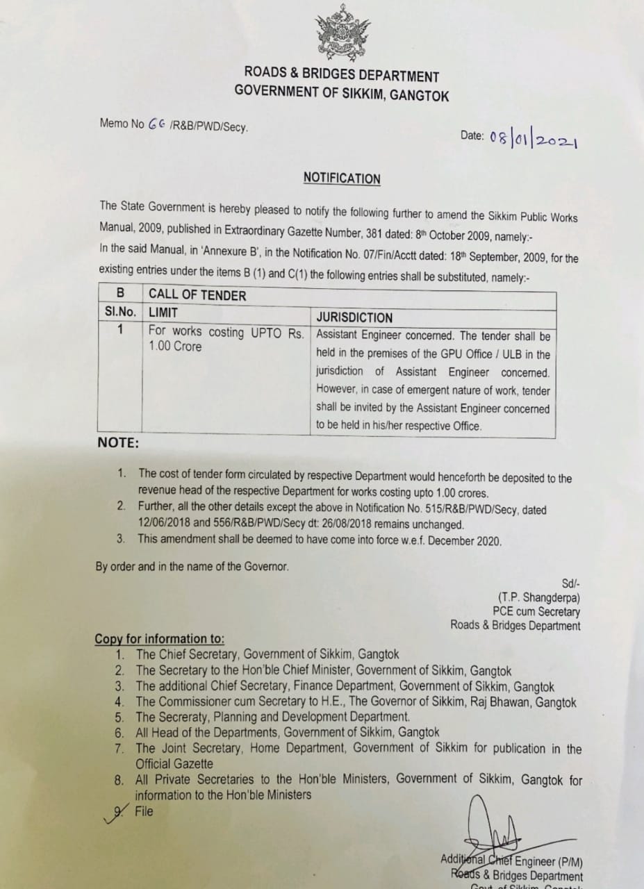 Memo No.229/GOS/FEWMD. Dated: 11/3/2015. Notification - Sikkim Forests, Water Courses and Road Reserve (Preservation and Protection) Act, 1988. |